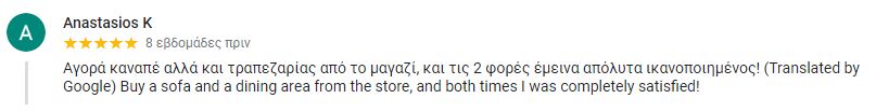 Αγορά καναπέ αλλά και τραπεζαρίας από το μαγαζί, και τις 2 φορές έμεινα απόλυτα ικανοποιημένος!