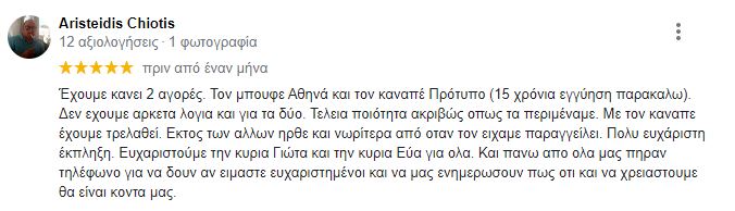 Έχουμε κανει 2 αγορές. Τον μπουφε Αθηνά και τον καναπέ Πρότυπο (15 χρόνια εγγύηση παρακαλω). Δεν εχουμε αρκετα λογια και για τα δύο. Τελεια ποιότητα ακριβώς οπως τα περιμέναμε. Με τον καναπε έχουμε τρελαθεί. Εκτος των αλλων ηρθε και νωρίτερα από οταν τον ειχαμε παραγγείλει. Πολυ ευχάριστη έκπληξη. Ευχαριστούμε την κυρια Γιώτα και την κυρια Εύα για ολα. Και πανω απο ολα μας πηραν τηλέφωνο για να δουν αν ειμαστε ευχαριστημένοι και να μας ενημερωσουν πως οτι και να χρειαστουμε θα είναι κοντα μας.
