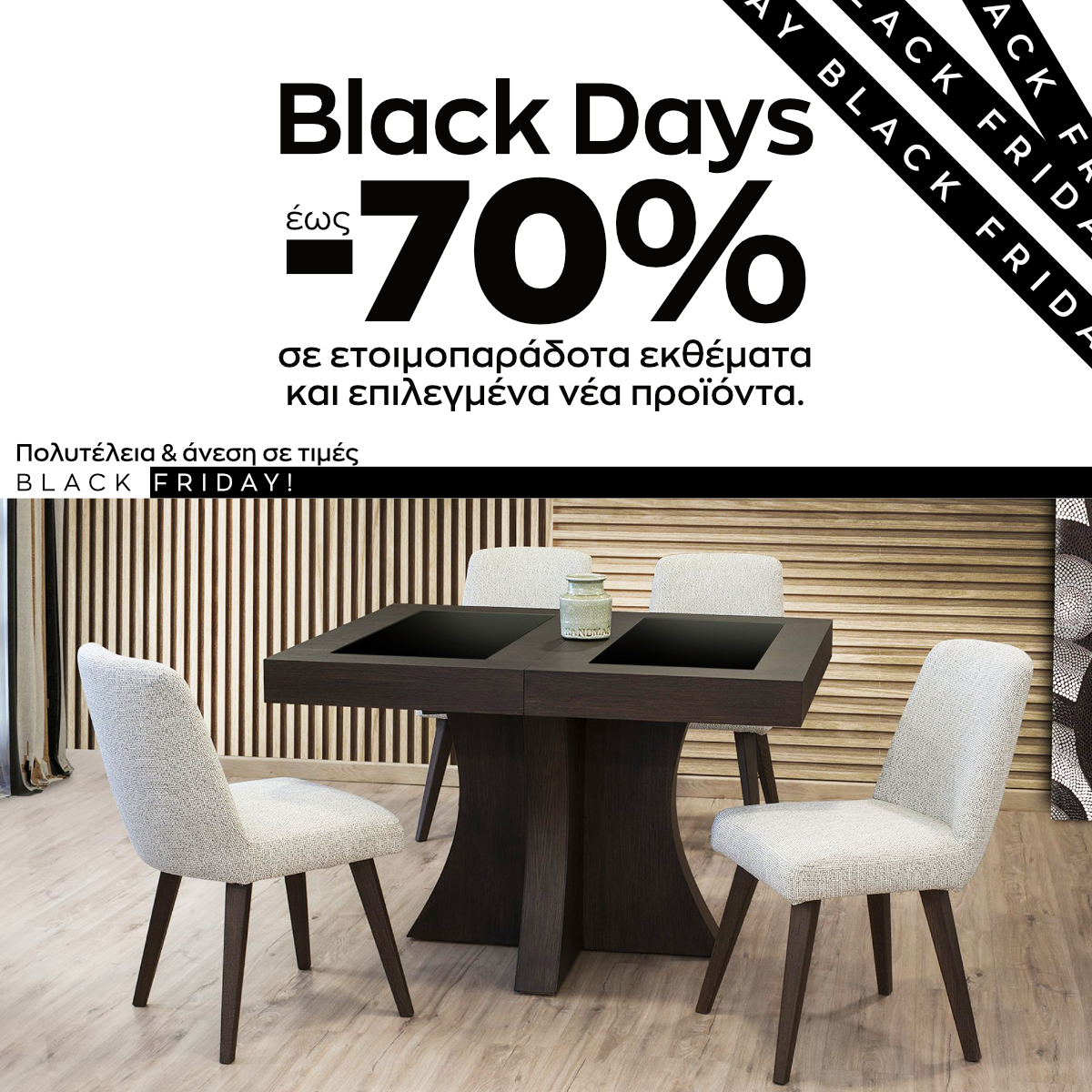 Φέτος οι Black Days φέρνουν μοναδικές ευκαιρίες για να ανανεώσετε το χώρο σας με στυλ και ποιότητα! Ανακαλύψτε μια τεράστια ποικιλία σε ετοιμοπαράδοτα και νέα προϊόντα με εκπτώσεις που αγγίζουν έως και το -70%! Είτε αναζητάτε κομψούς καναπέδες, μοντέρνες τραπεζαρίες είτε πρακτικές λύσεις για το γραφείο και το υπνοδωμάτιο, θα βρείτε την ιδανική επιλογή για εσάς!