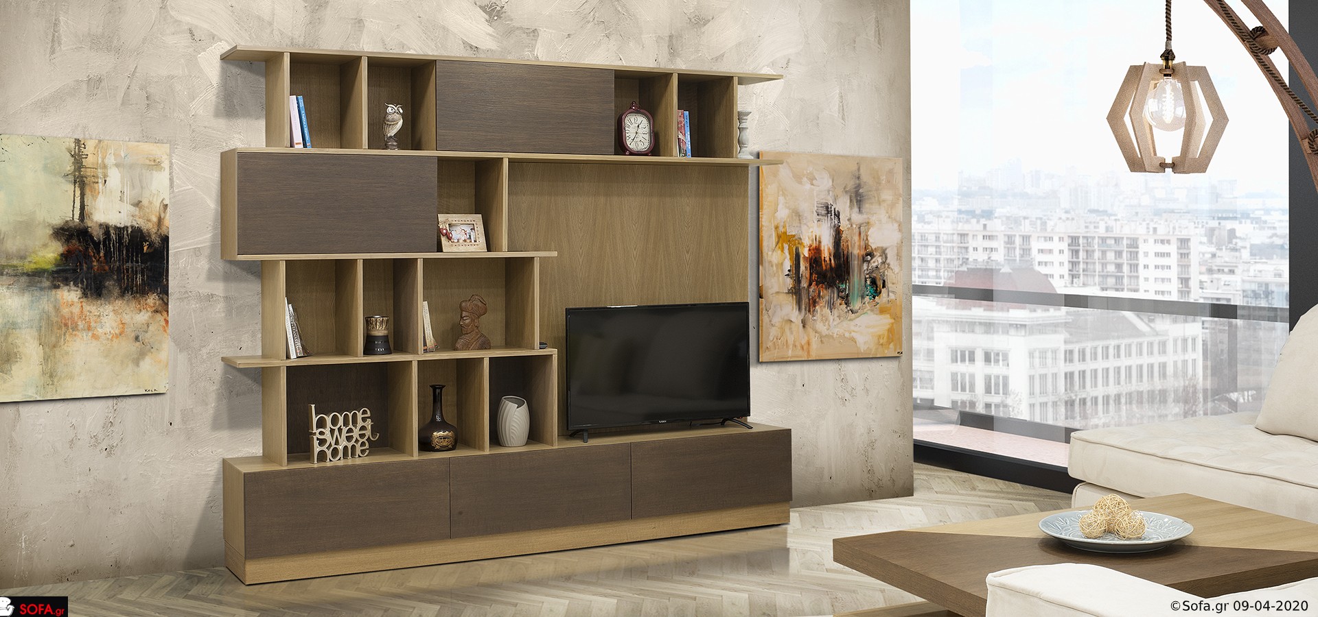 Ένα έργο τέχνης στο σαλόνι σας! Θέλοντας να ξεφύγουμε από τα αυστηρά σχεδιαστικά πλαίσια μιας επιπλοσύνθεσης, δημιουργήσαμε αυτό το πανέμορφο έργο τέχνης. Με αποθηκευτικούς χώρους, σε διχρωμία, που παίζουν μεταξύ τους σε ύψος και ράφια που πατάνε σε ξύλινη επιφάνεια. Τοποθετήσαμε ακόμα πιο ψηλά την βάση της τηλεόρασης για σας παρέχουμε την απόλυτη απόλαυση. Παίξαμε ακόμα και με τις διαστάσεις των αποθηκευτικών χώρων στην βάση. Δείτε εδώ.