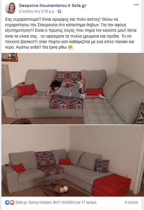 Σας ευχαριστουμε!! Ειναι ομορφος και πολυ ανετος! Θελω να ευχαριστησω την Σταυρουλα στο καταστημα θηβων. Για την αψογη εξυπηρετηση!!! Ειναι ο πρωτος λογος που πηρα τον καναπε μου! Μετα ειναι τα υλικα σας ..τα υφασματα τα πολλα χρωματα και σχεδια. Το οτι πλενετε βασικο!!! οταν πεφτει κατι καθαριζεται με ενα απλο πανακι και νερο. Αγαπω sofa!! Θα ξανα ρθω ????