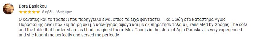 Ο καναπες και το τραπεζι που παρηγγειλα ειναι οπως τα ειχα φανταστει Η κα Θωδη στο καταστημα Αγιας Παρασκευης ειναι πολυ εμπειρη ακι με καοθηγησε αψογα και με εξυπηρετησε τελεια