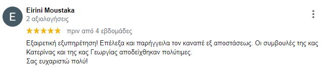 Εξαιρετική εξυπηρέτηση! Επέλεξα και παρήγγειλα τον καναπέ εξ αποστάσεως. Οι συμβουλές της κας Κατερίνας και της κας Γεωργίας αποδείχθηκαν πολύτιμες.