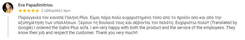 Eva Papadimitriou: Παρήγγειλα τον καναπέ Γαλήνη Plus. Είμαι πάρα πολύ ευχαριστημένη τόσο από το προϊόν όσο και από την εξυπηρέτηση των υπαλλήλων. Ξέρουν τη δουλειά τους και σέβονται τον πελάτη.