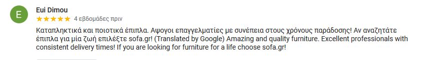 Καταπληκτικά και ποιοτικά έπιπλα. Αψογοι επαγγελματίες με συνέπεια στους χρόνους παράδοσης! Αν αναζητάτε έπιπλα για μία ζωή επιλέξτε sofa.gr! (Translated by Google) Amazing and quality furniture. Excellent professionals with consistent delivery times! If you are looking for furniture for a life choose sofa.gr!