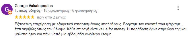 Εξαιρετική επιχείρηση με εξαιρετικά καταρτισμένους υπαλλήλους. Βρήκαμε τον καναπέ που ψάχναμε , έτσι ακριβώς όπως τον θέλαμε. Κάθε επιλογή είναι value for money. Η παράδοση έγινε στην ώρα της και μάλιστα ήταν και πάνω από μία εβδομάδα νωρίτερα έτοιμη.