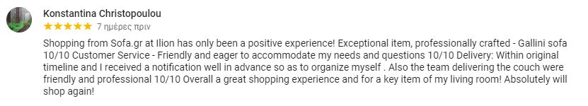 Shopping from Sofa.gr at Ilion has only been a positive experience! Exceptional item, professionally crafted - Gallini sofa 10/10 Customer Service - Friendly and eager to accommodate my needs and questions 10/10 Delivery: Within original timeline and I received a notification well in advance so as to organize myself . Also the team delivering the couch were friendly and professional 10/10 Overall a great shopping experience and for a key item of my living room! Absolutely will shop again!