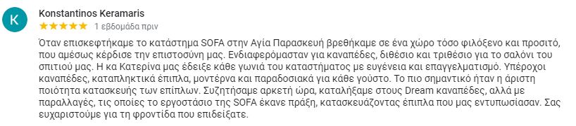Όταν επισκεφτήκαμε το κατάστημα SOFA στην Αγία Παρασκευή βρεθήκαμε σε ένα χώρο τόσο φιλόξενο και προσιτό, που αμέσως κέρδισε την επιστοσύνη μας. Ενδιαφερόμασταν για καναπέδες, διθέσιο και τριθέσιο για το σαλόνι του σπιτιού μας. Η κα Κατερίνα μας έδειξε κάθε γωνιά του καταστήματος με ευγένεια και επαγγελματισμό. Υπέροχοι καναπέδες, καταπληκτικά έπιπλα, μοντέρνα και παραδοσιακά για κάθε γούστο. Το πιο σημαντικό ήταν η άριστη ποιότητα κατασκευής των επίπλων. Συζητήσαμε αρκετή ώρα, καταλήξαμε στους Dream καναπέδες, αλλά με παραλλαγές, τις οποίες το εργοστάσιο της SOFA έκανε πράξη, κατασκευάζοντας έπιπλα που μας εντυπωσίασαν. Σας ευχαριστούμε για τη φροντίδα που επιδείξατε.