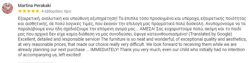 Εξαιρετική, αναλυτική και υπεύθυνη εξυπηρέτηση! Τα έπιπλα τόσο προσεγμένα και υπέροχα, εξαιρετικής ποιότητας και αισθητικής, σε πολύ λογικές τιμές, που έκαναν την επιλογή μας πραγματικά πολύ δύσκολη. Ανυπομονούμε να τα παραλάβουμε ενώ ήδη σχεδιάζουμε την επόμενη αγορά μας... ΑΜΕΣΑ! Σας ευχαριστούμε πολύ, ακόμη και το παιδί μας που αρχικά δεν είχε καμία διάθεση να μας συνοδεύσει, έφυγε κατενθουσιασμένο!
