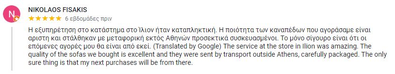 Η εξυπηρέτηση στο κατάστημα στο Ίλιον ήταν καταπληκτική. Η ποιότητα των καναπέδων που αγοράσαμε είναι αριστη και στάλθηκαν με μεταφορική εκτός Αθηνών προσεκτικά συσκευασμένοι. Το μόνο σίγουρο είναι ότι οι επόμενες αγορές μου θα είναι από εκεί.