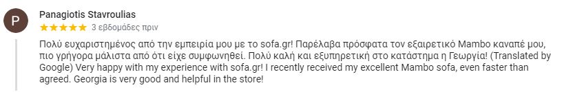 Πολύ ευχαριστημένος από την εμπειρία μου με το sofa.gr! Παρέλαβα πρόσφατα τον εξαιρετικό Mambo καναπέ μου, πιο γρήγορα μάλιστα από ότι είχε συμφωνηθεί. Πολύ καλή και εξυπηρετική στο κατάστημα η Γεωργία!