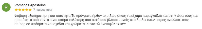 Φοβερή εξυπηρέτηση, και ποιότητα.Τα πράγματα ήρθαν ακριβώς όπως τα είχαμε παραγγείλει και στην ώρα τους και η ποιότητα από κοντά είναι ακόμα καλύτερη από αυτό που βλέπει κανείς στο διαδίκτυο.Απειρες εναλλακτικές επίσης σε υφάσματα και σχέδια και χρώματα. Συνιστώ ανεπιφύλακτα!!!