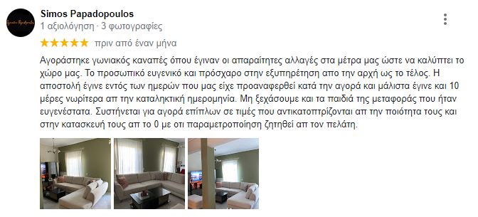 Αγοράστηκε γωνιακός καναπές όπου έγιναν οι απαραίτητες αλλαγές στα μέτρα μας ώστε να καλύπτει το χώρο μας. Το προσωπικό ευγενικό και πρόσχαρο στην εξυπηρέτηση απο την αρχή ως το τέλος. Η αποστολή έγινε εντός των ημερών που μας είχε προαναφερθεί κατά την αγορά και μάλιστα έγινε και 10 μέρες νωρίτερα απ την καταληκτική ημερομηνία. Μη ξεχάσουμε και τα παιδιά της μεταφοράς που ήταν ευγενέστατα. Συστήνεται για αγορά επίπλων σε τιμές που αντικατοπτρίζονται απ την ποιότητα τους και στην κατασκευή τους απ το 0 με οτι παραμετροποίηση ζητηθεί απ τον πελάτη.