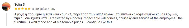 Άψογη η προθυμία η ευγενεια και η εξυπηρέτηση των υπαλλήλων ..τα έπιπλα καλοφτιαγμένα και σε λογικές τιμές...συνεχίστε έτσι