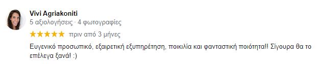Ευγενικό προσωπικό, εξαιρετική εξυπηρέτηση, ποικιλία και φανταστική ποιότητα!! Σίγουρα θα το επέλεγα ξανά!