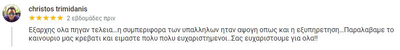 Εξαρχης ολα πηγαν τελεια…η συμπεριφορα των υπαλληλων ηταν αψογη οπως και η εξυπηρετηση…Παραλαβαμε το καινουριο μας κρεβατι και ειμαστε πολυ πολυ ευχαριστημενοι..Σας ευχαριστουμε για ολα!!