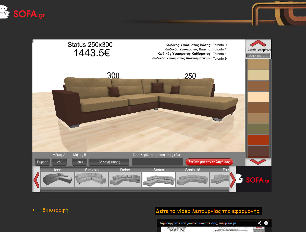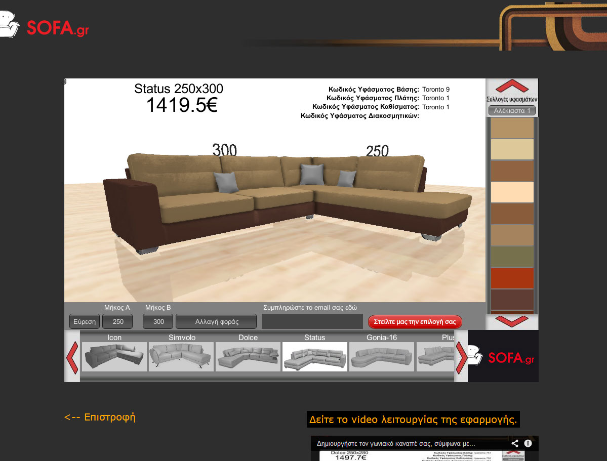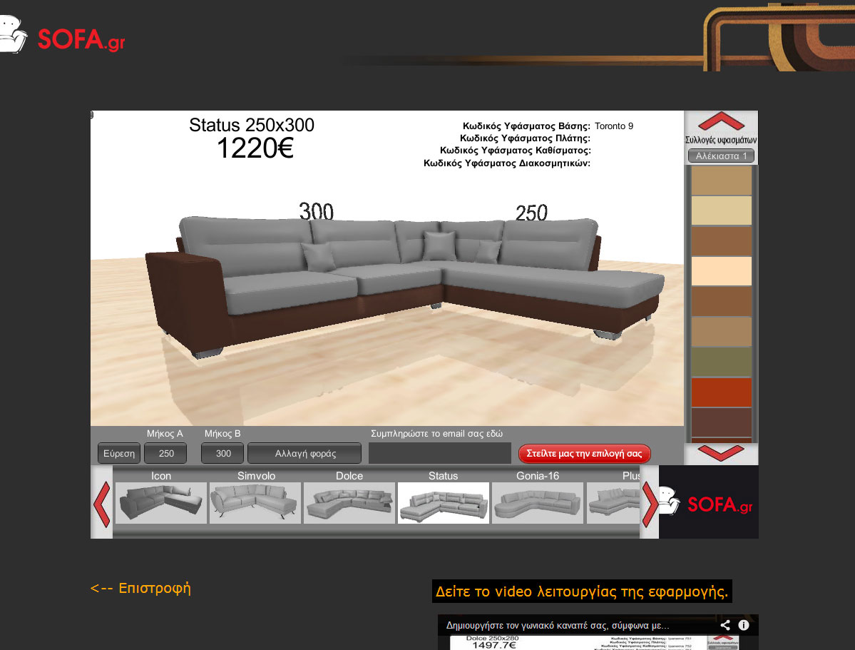 Όταν έρχεται η ώρα να αγοράσουμε καναπέ όλοι προσπαθούμε να φανταστούμε πως θα είναι το τελικό αποτέλεσμα και αν θα δένει όμορφα με τον υπόλοιπο χώρο του σπιτιού. Τώρα με την νέα μας εφαρμογή μπορείτε από το σπίτι σας να δημιουργήσετε τον δικό σας γωνιακό καναπέ, διαλέγοντας το σχέδιο, το μέγεθος, τη φορά και το ύφασμα ενώ παράλληλα μπορεί να βλέπετε και την τελική του τιμή! Μπορείτε να «παίξετε» όση ώρα θέλετε με τα χρώματα μέχρι να πετύχετε το ιδανικό για σας αποτέλεσμα!