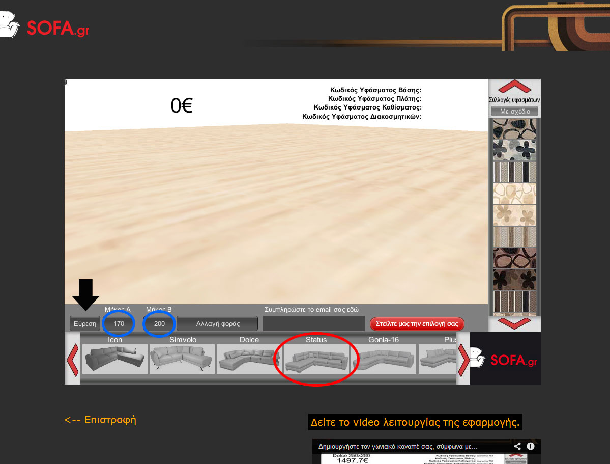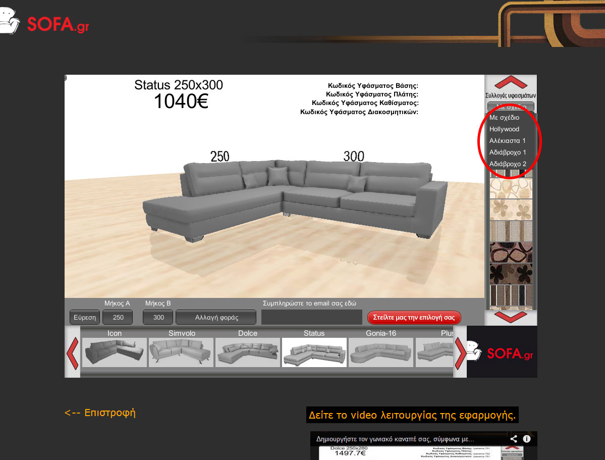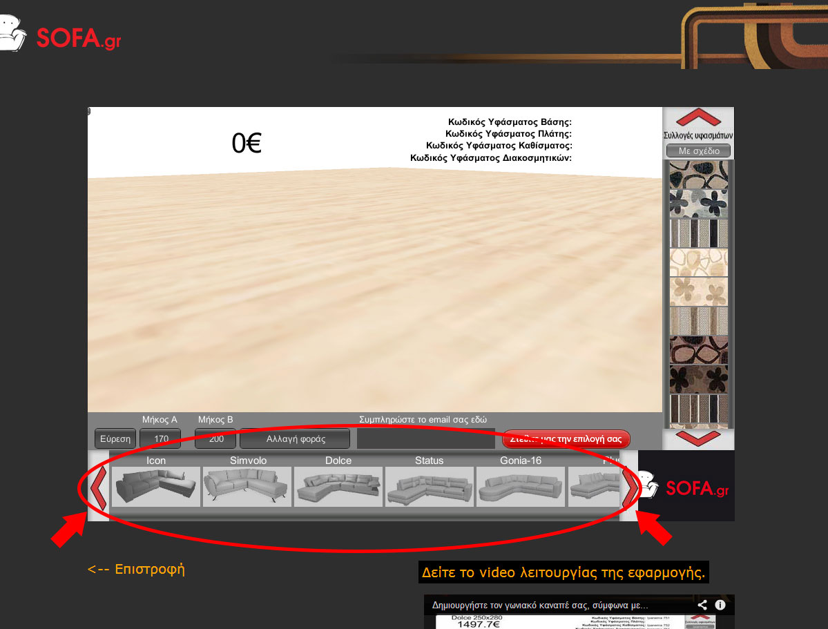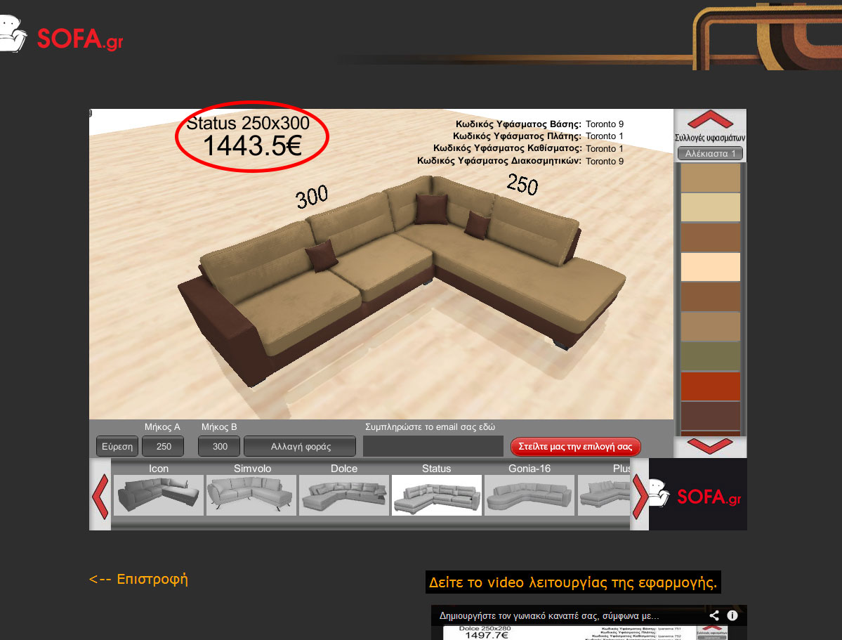 Όταν έρχεται η ώρα να αγοράσουμε καναπέ όλοι προσπαθούμε να φανταστούμε πως θα είναι το τελικό αποτέλεσμα και αν θα δένει όμορφα με τον υπόλοιπο χώρο του σπιτιού. Τώρα με την νέα μας εφαρμογή μπορείτε από το σπίτι σας να δημιουργήσετε τον δικό σας γωνιακό καναπέ, διαλέγοντας το σχέδιο, το μέγεθος, τη φορά και το ύφασμα ενώ παράλληλα μπορεί να βλέπετε και την τελική του τιμή! Μπορείτε να «παίξετε» όση ώρα θέλετε με τα χρώματα μέχρι να πετύχετε το ιδανικό για σας αποτέλεσμα!