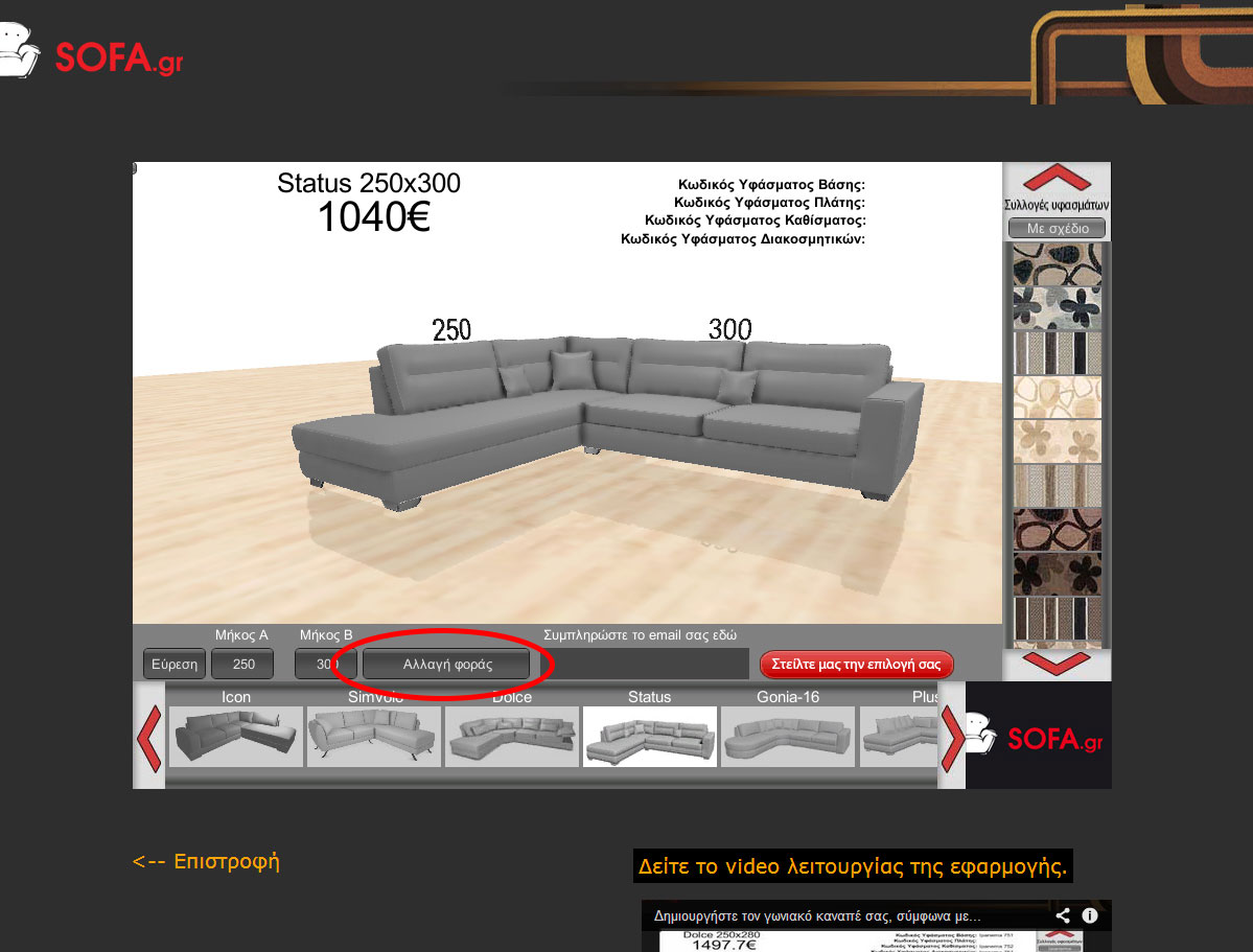 Αν η φορά της γωνίας του καναπέ που εμφανίστηκε δεν βολεύει στο χώρο μας και θέλουμε την αντίθετη, τότε πατάμε το κουμπί Αλλαγή φοράς (εικόνα 7).