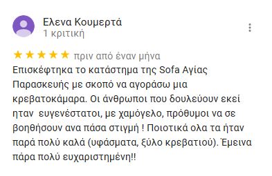 Επισκέφτηκα το κατάστημα της Sofa Αγίας Παρασκευής με σκοπό να αγοράσω μια κρεβατοκάμαρα. Οι άνθρωποι που δουλεύουν εκεί ηταν ευγενέστατοι, με χαμόγελο, πρόθυμοι να σε βοηθήσουν ανα πάσα στιγμή ! Ποιοτικά ολα τα ήταν παρά πολύ καλά (υφάσματα, ξύλο κρεβατιού). Έμεινα πάρα πολύ ευχαριστημένη!!