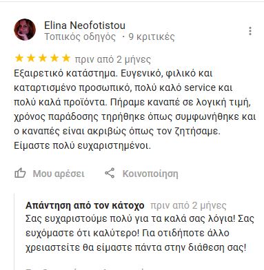Εξαιρετικό κατάστημα. Ευγενικό, φιλικό και καταρτισμένο προσωπικό, πολύ καλό service και πολύ καλά προϊόντα. Πήραμε καναπέ σε λογική τιμή, χρόνος παράδοσης τηρήθηκε όπως συμφωνήθηκε και ο καναπές είναι ακριβώς όπως τον ζητήσαμε. Είμαστε πολύ ευχαριστημένοι.