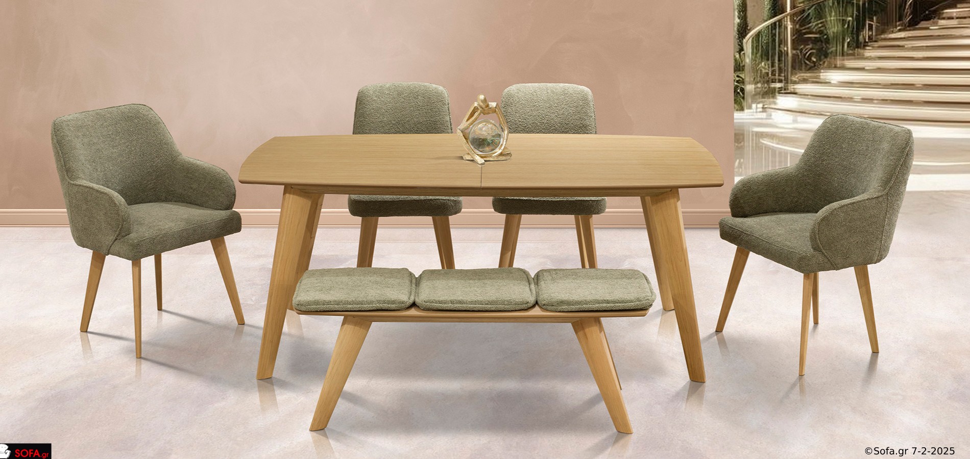 - Τραπεζαρία: Η καθαρή γραμμή του σχεδίου και η φυσική υφή του ξύλου αναδεικνύουν την απλότητα και την αρμονία της, καθιστώντας το ένα διαχρονικό κομμάτι που αναδεικνύει τον χώρο σας.