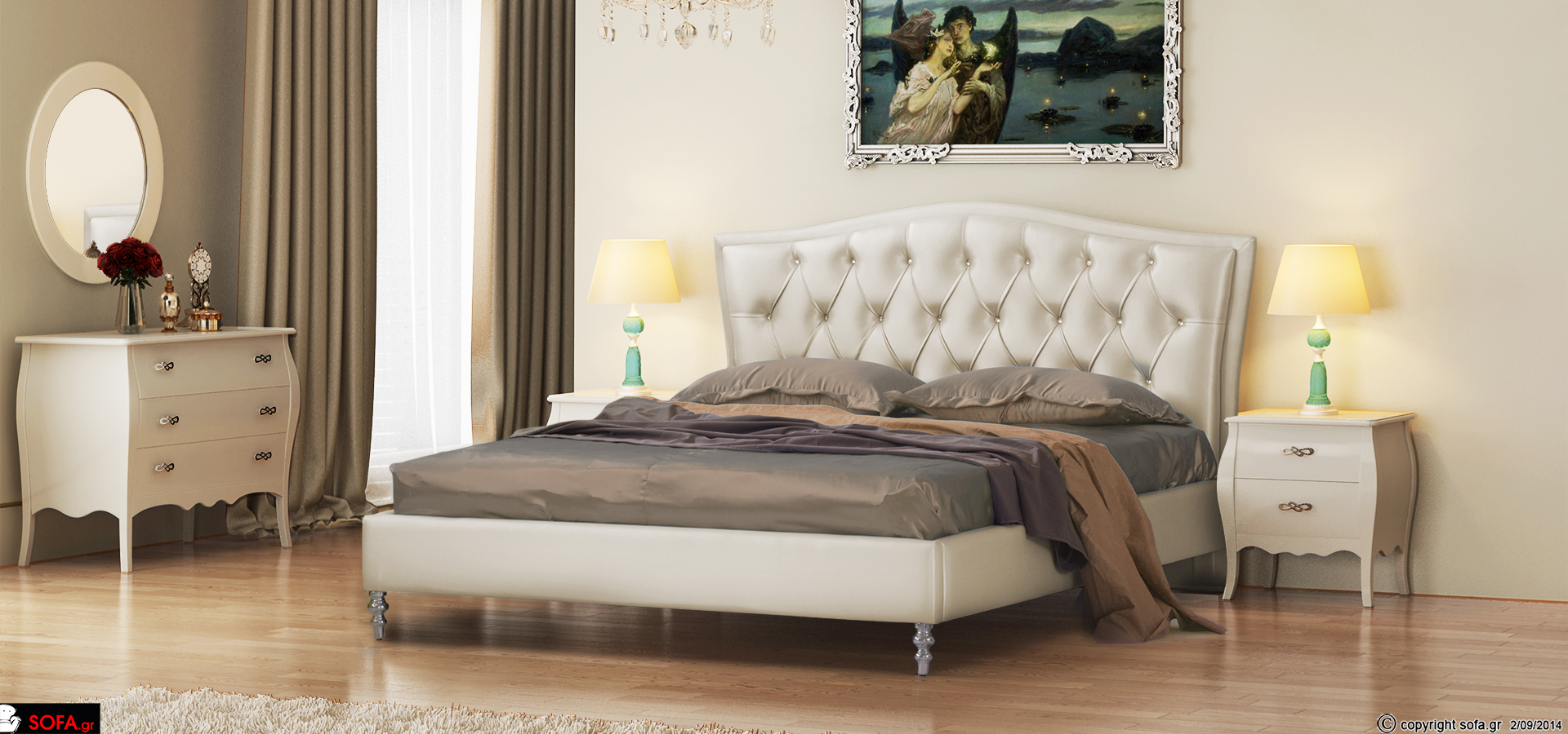 Όσο και να προχωράει η μόδα και οι τάσεις της, μια αριστοκρατική κρεβατοκάμαρα πάντα μας κάνει να νοσταλγούμε τις παλιές εποχές! Μοναδικό κεφαλάρι με στρας, πόδια από inox και προσεγμένες λεπτομέρειες σε όλα τα σημεία σχεδιασμού! Επιλέξτε τα ασορτί κομοδίνα, συρταριέρα και καθρέπτη. Ολοκληρώστε την διακόσμηση με ανάλογες κουρτίνες, σεντόνια και πίνακες που θα παραπέμπουν σε διαφορετική αρχοντική εποχή!