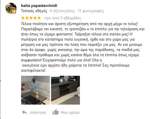 Τέλεια ποιότητα και άριστη εξυπηρέτηση από την αρχή μέχρι το τελος! Παραλάβαμε τον καναπέ, το τραπεζάκι κ το έπιπλο για την τηλεόραση και ήταν όπως τα είχαμε φανταστεί. Ταίριαξαν τέλεια στο σαλόνι μας! Η πωλήτρια στο κατάστημα πολύ ευγενική, ηρθε και στο χώρο μας για μέτρηση και μας πρότεινε την λύση που ταιριάζει για μας. Αν και μενουμε στον 4ο όροφο, χωρίς ανσασερ, την ώρα της παράδοσης, τα παιδιά μας ανέβασαν πρόθυμα και χωρίς κανένα θέμα όλα τα έπιπλα όπως είχαμε συμφωνήσει! Ευχαριστούμε πολύ για όλα! Ολη η οικογένεια εχει αρχίσει ήδη χαίρεται τα έπιπλα! Σας προτείνουμε ανεπιφύλακτα!