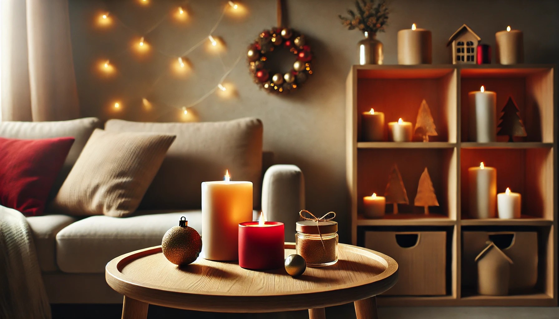 Ο φωτισμός παίζει καθοριστικό ρόλο στη χριστουγεννιάτικη ατμόσφαιρα. Προσθέστε επιτραπέζια φωτιστικά ή λαμπάκια LED γύρω από τα ράφια, την βιβλιοθήκη ή και τον μπουφέ σας. Διακοσμήστε το τραπεζάκι του σαλονιού με αρωματικά κεριά σε χριστουγεννιάτικες αποχρώσεις, όπως κόκκινο, χρυσό ή ασημί.