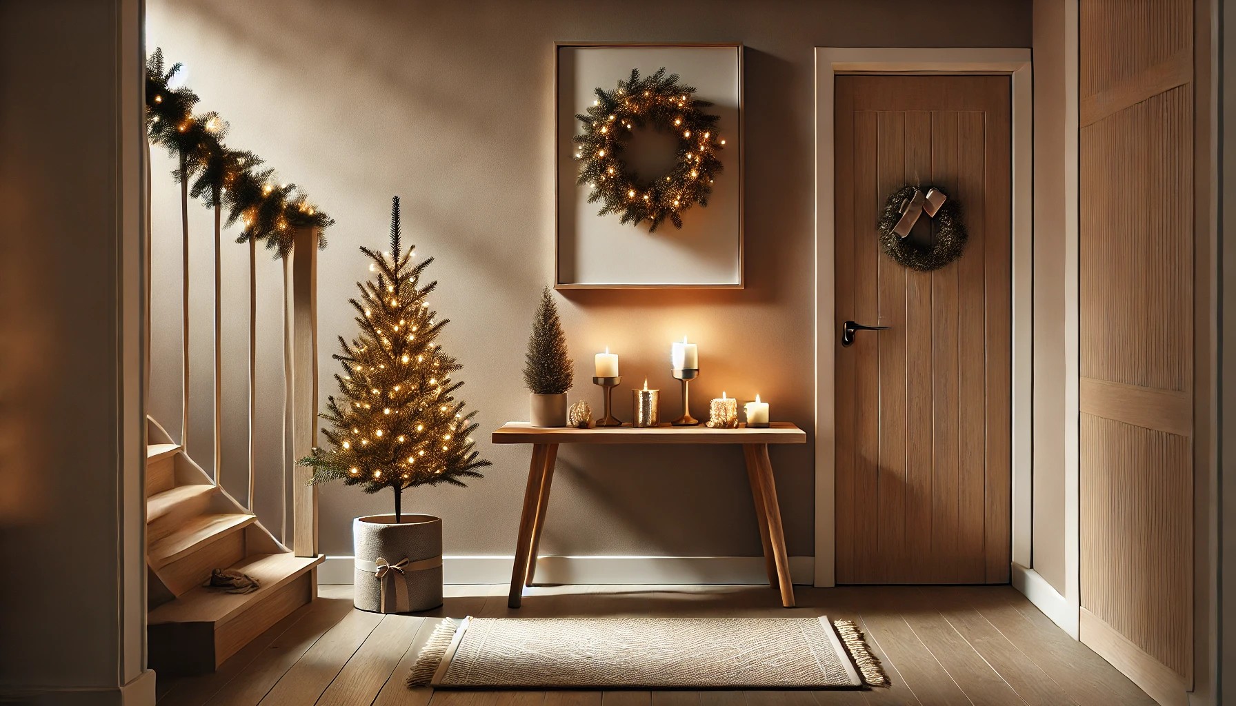 Η είσοδος είναι το πρώτο σημείο του σπιτιού που βλέπουν οι καλεσμένοι σας. Διακοσμήστε το έπιπλο εισόδου με ένα μικρό δέντρο, φωτάκια και ένα όμορφο στεφάνι στον τοίχο. Ένα γιορτινό χαλάκι στην είσοδο θα δημιουργήσει μια ζεστή και φιλόξενη ατμόσφαιρα για τους καλεσμένους σας.