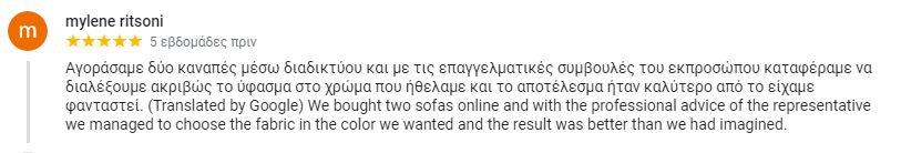 Αγοράσαμε δύο καναπές μέσω διαδικτύου και με τις επαγγελματικές συμβουλές του εκπροσώπου καταφέραμε να διαλέξουμε ακριβώς το ύφασμα στο χρώμα που ήθελαμε και το αποτέλεσμα ήταν καλύτερο από το είχαμε φανταστεί.