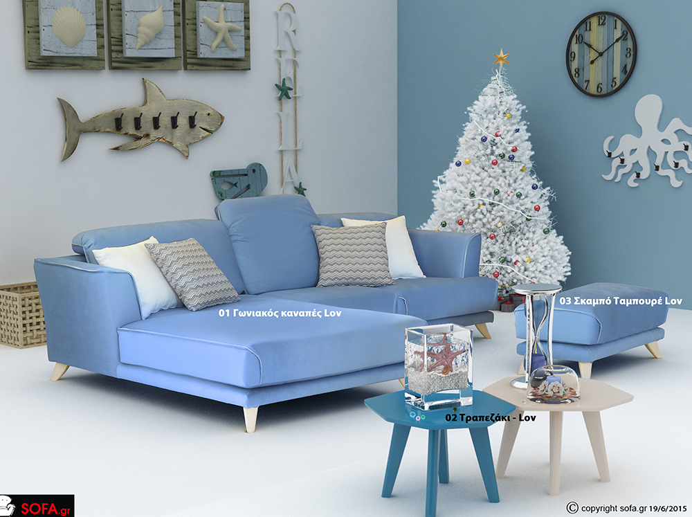 01. Γωνιακός καναπές Lov. Καινοτομικό, μοντέρνο σχέδιο με πλάτη ανάκλισης και βαθύτερο ανάκλιντρο για απολαυστικές στιγμές ξεκούρασης! Δείτε λεπτομέρειες εδώ. 02. Τραπεζάκι Lov. Τραπεζάκι σαλονιού σε ημιμασίφ κατασκευή και μοντέρνο πολυγωνικό σχέδιο! Επιλέξτε περισότερα απο ένα! Δείτε λεπτομέρειες εδώ 03. Σκαμπό Ταμπουρέ Lov. Ένα σκαμπό είναι πάντα βολικο σε ένα σαλόνι