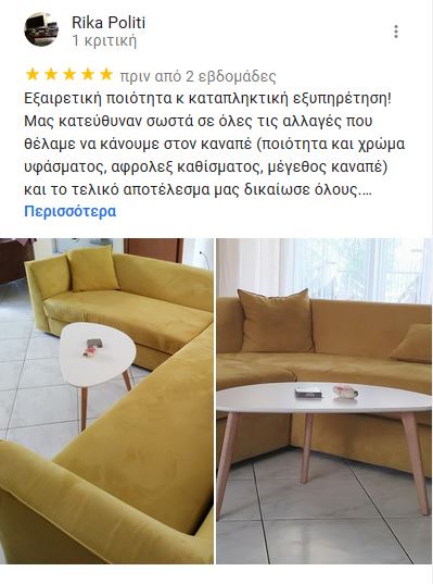 Εξαιρετική ποιότητα κ καταπληκτική εξυπηρέτηση! Μας κατεύθυναν σωστά σε όλες τις αλλαγές που θέλαμε να κάνουμε στον καναπέ (ποιότητα και χρώμα υφάσματος, αφρολεξ καθίσματος, μέγεθος καναπέ) και το τελικό αποτέλεσμα μας δικαίωσε όλους. Ειδικά για το μέγεθος του καναπέ, μας επισκέφτηκε ο Αλέξης με πατρόν, τα οποία τοποθέτησε στο πάτωμα και καταλάβαμε ακριβώς το χώρο που θα καταλάμβανε ο καναπές στο σαλόνι. Ευχαριστούμε θερμά!