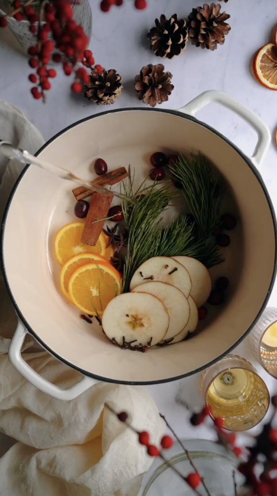 Τις ημέρες των γιορτών όλοι θέλουμε το σπίτι μας να μοσχοβολάει τα εποχικά αρώματα και να ευωδιάζει αγαλλίαση και ηρεμία. Εκτός, από αρωματικά προϊόντα ή τις μυρωδιές από τα σπιτικά γλυκά που ψήνονται στον φούρνο, υπάρχει ένας ακόμα εύκολος και γρήγορος τρόπος να δώσετε άρωμα Χριστουγέννων στο σπίτι σας. Σε μια μικρή κατσαρόλα ρίξτε νερό, 2-3 φέτες μήλου και πορτοκαλιού, γαρίφαλο, κανέλα, μοσχοκάρυδο και αφήστε τα να σιγοβράσουν. Ανά διαστήματα μπορείτε να προσθέτετε και άλλο νερό ώστε να διατηρηθεί όσο περισσότερο γίνεται. Η υπέροχη μυρωδιά του θα γεμίσει το σπίτι και θα δημιουργήσει ένα υπέροχο vibe. Σε πολλούς αρέσει να προσθέτουν και cranberry, κοτσάνια από πεύκο ή κέδρο καθώς και αιθέρια έλαια για να ενισχύσουν τον χειμωνιάτικο χαρακτήρα του συγκεκριμένου αρωματικού.