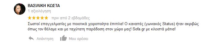 Σωστοί επαγγελματίες με ποιοτικά χειροποίητα έπιπλα! Ο καναπές (γωνιακός Status) ήταν ακριβώς όπως τον θέλαμε και με ταχύτατη παράδοση στον χώρο μας! Sofa.gr με κλειστά μάτια!